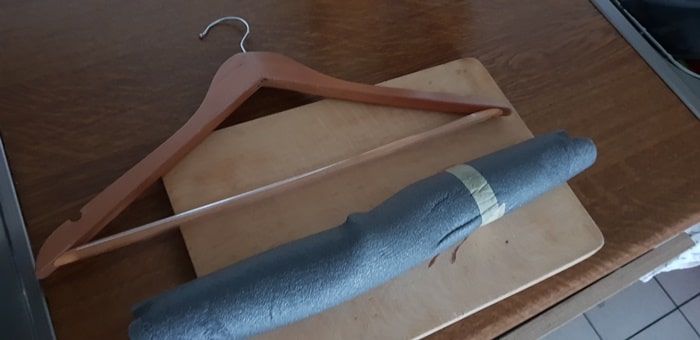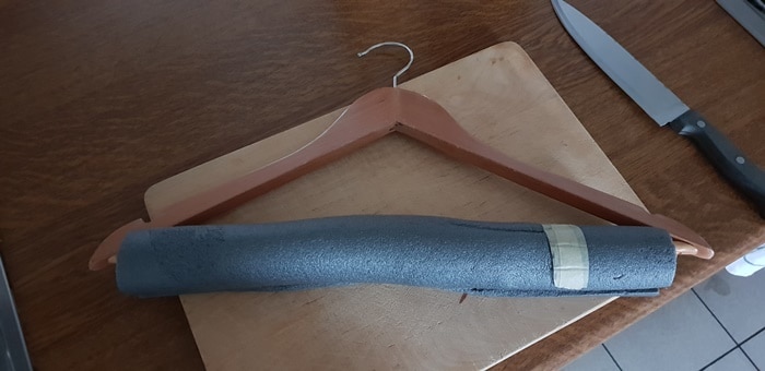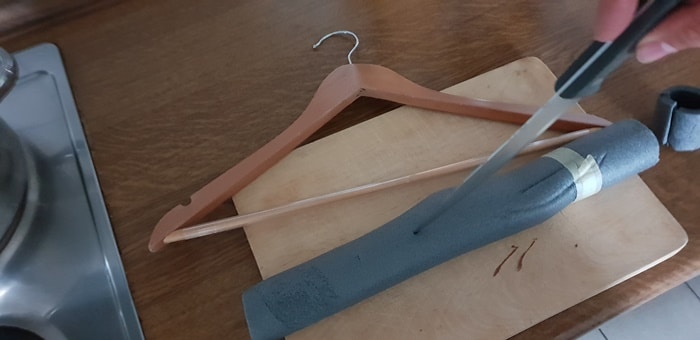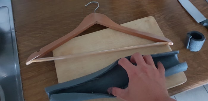 - Du schneidest die Rohrisolation längs auf und legst sie um den Kleiderbügel.
